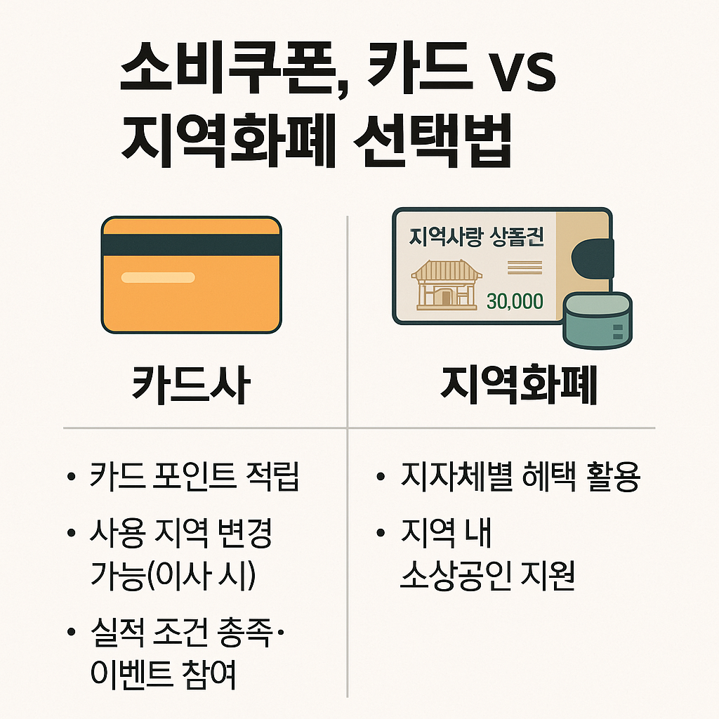 소비쿠폰, 카드 vs 지역화폐 선택법을 따질 때, 포인트와 실적, 이벤트 응모까지 누리고 싶은 소비자는 카드 방식을 추천합니다.
