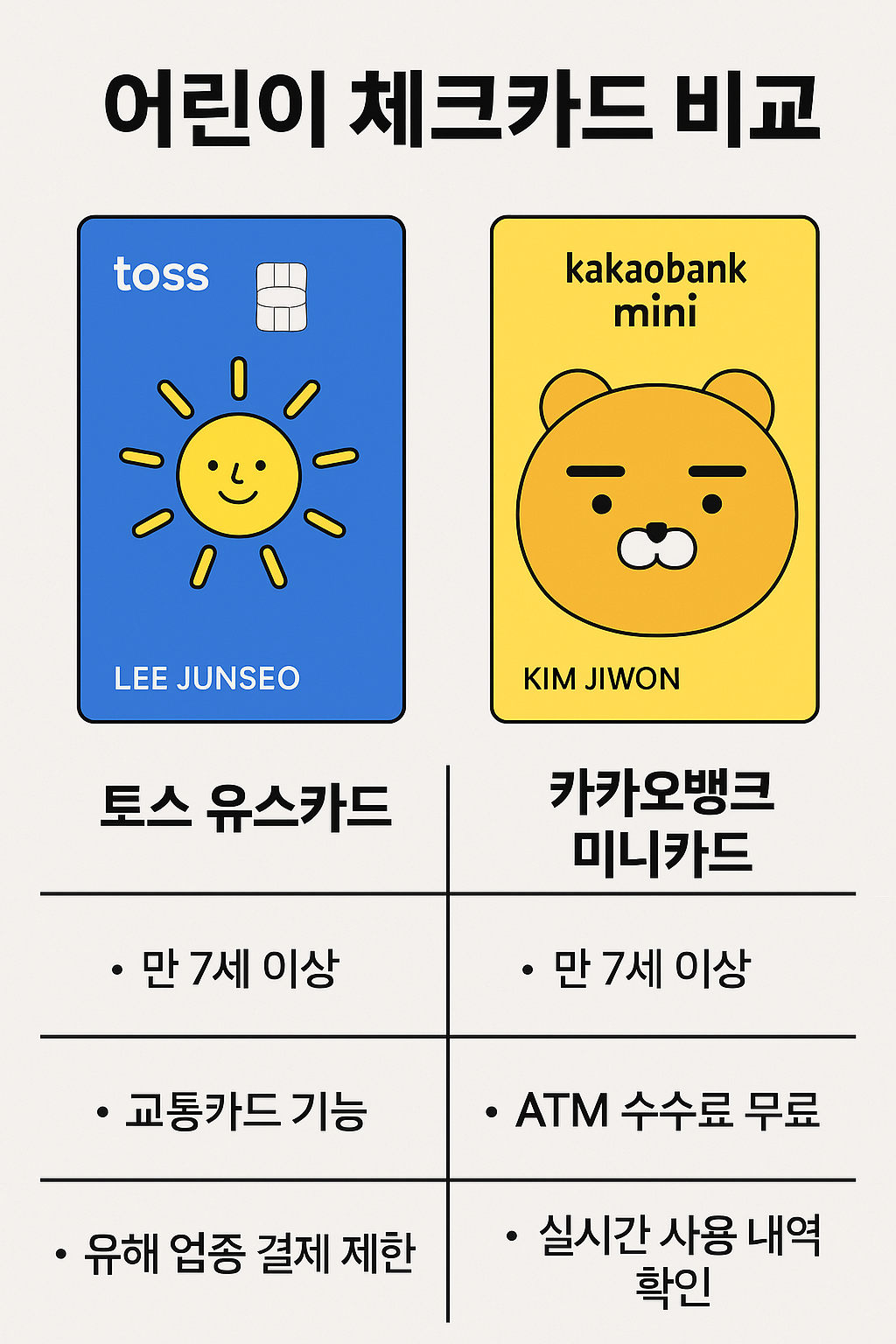 토스뱅크 키즈카드 vs 카카오뱅크 미니카드 기본 사양 비교