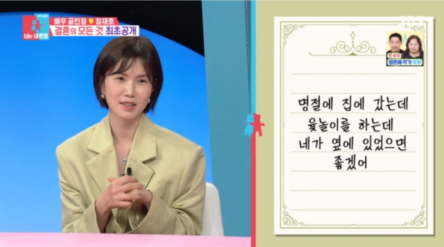 공민정은 남편이 건넨 청혼 편지에 대해 “보통은 사랑한다고 하거나 설렌다고 해야 하는데, 남편은 ‘명절 윷놀이할 때 네가 옆에 있으면 좋겠다’고 썼다”며 웃음을 터뜨렸다.